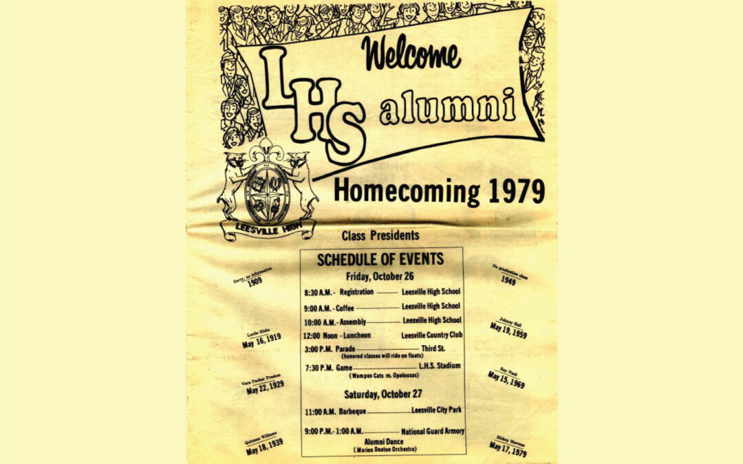 The celebration began on Friday, October 26, 1979, with registration at 8:30 a.m. at Leesville High School. Soon after, at 9:00 a.m., alumni and guests enjoyed coffee as they reunited with classmates and shared memories. At 10:00 a.m., the annual Homecoming assembly was held, where past and present Wampus Cats gathered in the high school auditorium to celebrate traditions and honor alumni leaders. At 12:00 noon, the Dutch Treat luncheon at the Leesville Country Club offered an opportunity for fellowship and reconnection before the afternoon’s big event.
